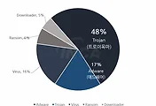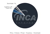 9월 한달 간 탐지된 악성코드를 유형별로 비교하였을 때 Virus(바이러스) 88%로 가장 높은 비중을 차지하였고, Adware(애드웨어)6%, Trojan(트로이목마)Suspicious(의심진단)가 각각 2%, Worm()1%로 그 뒤를 따랐다.