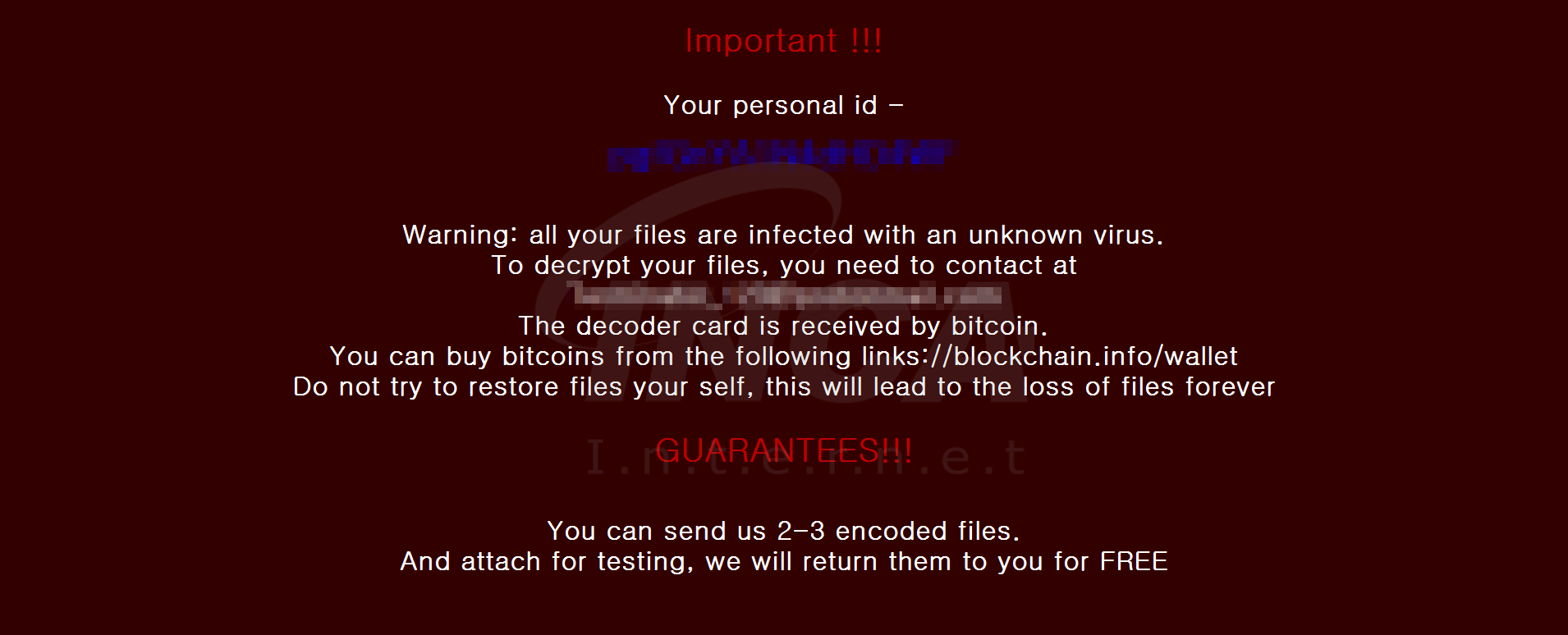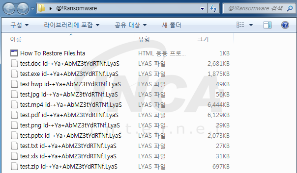 ‘LockCrypt’ 랜섬웨어는 “C:\Windows” 경로를 제외한 모든 경로에서 32byte 이상의 크기의 모든 파일을 암호화한다. 암호화된 폴더마다 랜섬노트가 생성되며, 암호화가 완료된 파일은 원본 확장명 뒤에 “id-랜덤 문자열.LyaS”를 덧붙인다.