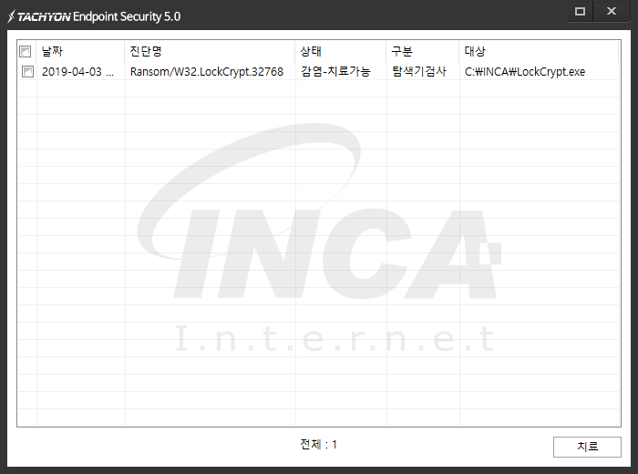 상기 악성코드는 잉카인터넷 안티바이러스 제품 TACHYON Internet Security 5.0에서 진단 및 치료가 가능하다.