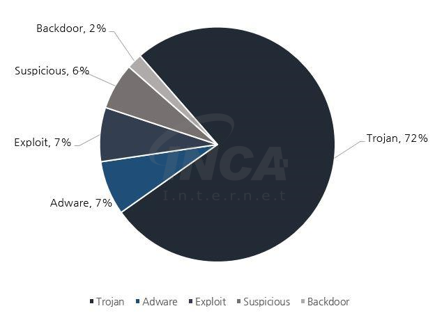 3월 한달 간 탐지된 악성코드를 유형별로 비교하였을 때 Trojan(트로잔)이 72%로 가장 높은 비중을 차지하였고, Adware(애드웨어)와 Exploit(익스플로잇)이 각각 7%와 7%, Suspicious(서스피셔스)와 Backdoor(백도어)이 각각 6%, 2%씩으로 그 뒤를 따랐다.