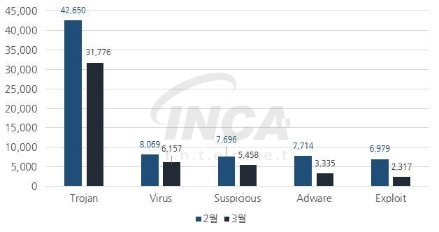 3월에는 악성코드 유형별로 2월과 비교하였을 때 대부분의 악성코드 진단 수가 감소하였다.