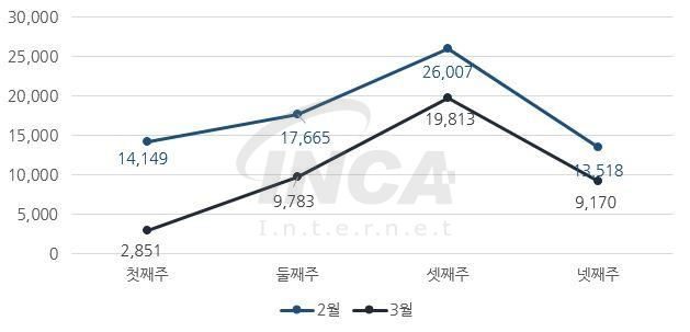 3월 한달 동안 악성코드 진단 현황을 주 단위로 살펴보았을 때 2월에 비해 감소한 추이를 보이고 있다.