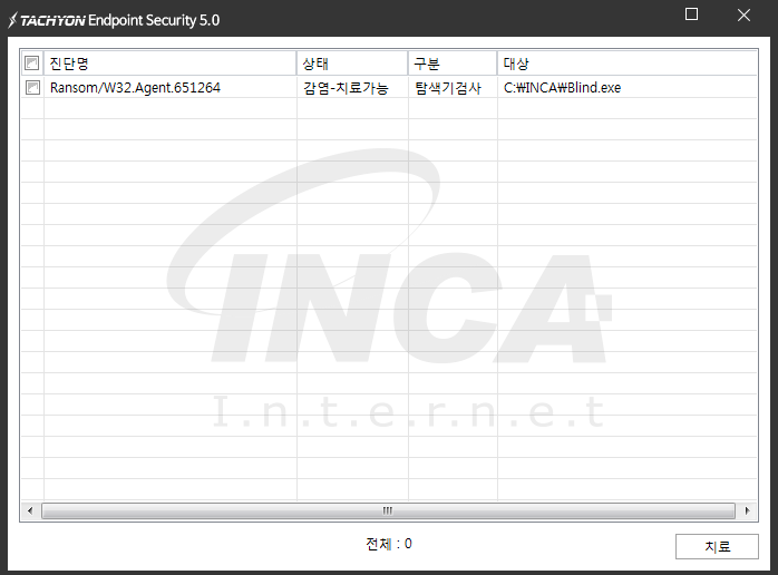 상기 악성코드는 잉카인터넷 안티바이러스 제품 TACHYON Endpoint Security 5.0에서 진단 및 치료가 가능하다.