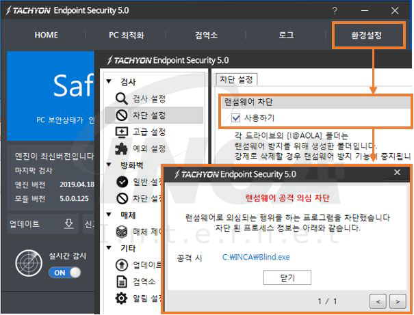 TACHYON Endpoint Security 5.0에서 랜섬웨어 차단 기능을 이용하면 의심되는 파일의 암호화 행위를 차단할 수 있다.