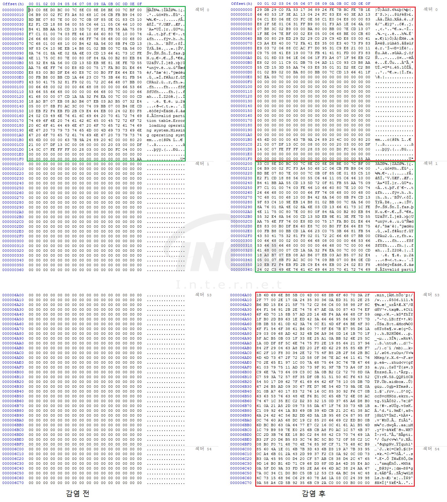 해당 악성코드는 MBR 영역을 변조하는데 섹터 0의 정상 MBR 코드를 섹터 1로 복사하고, 섹터 0과 섹터 2~54에 악성 쉘 코드로 덮어쓴다.