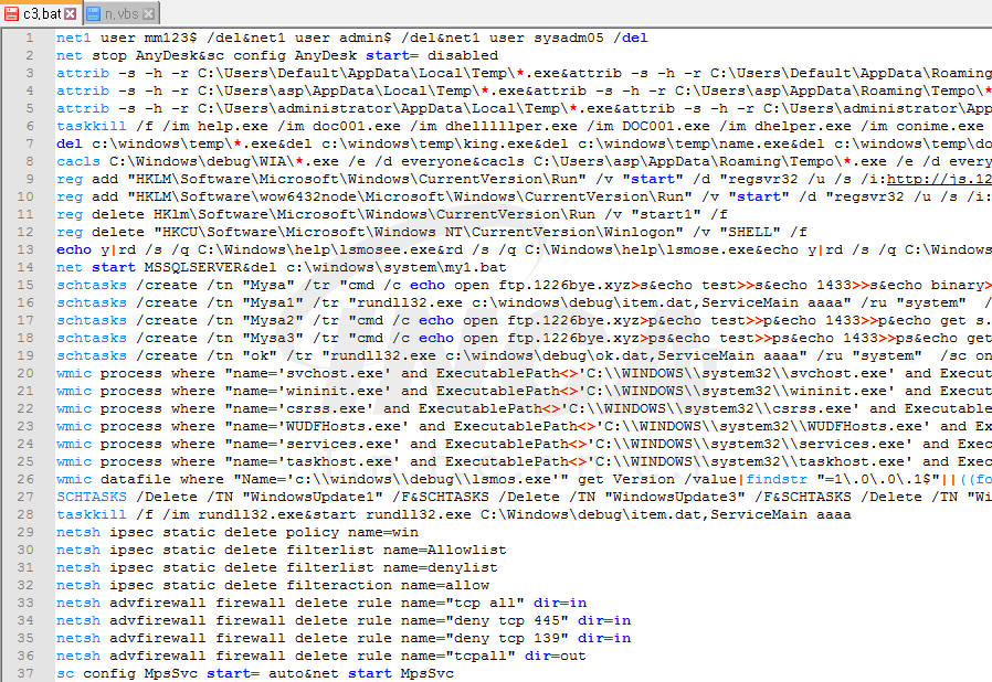 다운로드 된 압축파일(‘msief.exe’)에는 자가 등록, 예약된 작업 등록, 특정 프로세스 종료, 윈도우 방화벽 설정 변경, 파일 및 폴더에 대한 사용자 권한을 변경 등 동작을 수행하는 배치파일(‘c3.bat’)과 배치파일을 호출하는 vbs 파일을 포함한다.