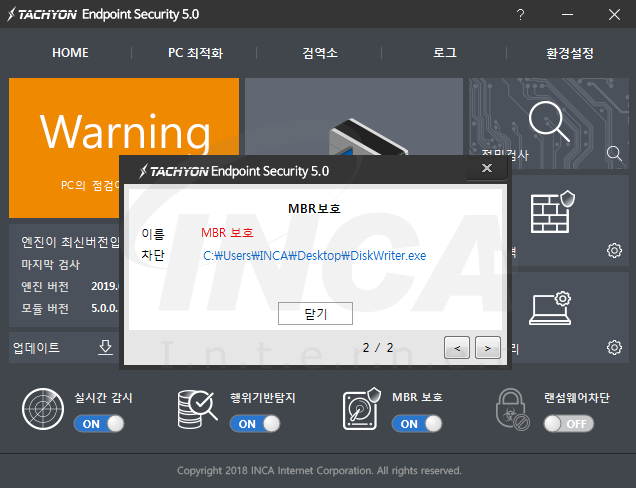 상기 악성코드는 잉카인터넷 안티바이러스 제품 TACHYON Internet Security 5.0의 MBR 보호기능으로 실행을 방지할 수 있다.