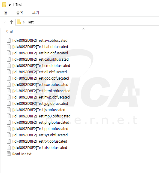 BigBobRoss 랜섬웨어 실행 시, 해당 랜섬웨어는 모든 파일을 암호화 대상으로 삼는다. 대상이 되는 파일을 암호화 시키면서 [그림 7] 과 같이 [id=(임의의id값)](원본파일명).(원본확장자명).obfuscated 라는 파일명으로 변경한다. 또한 암호화를 완료한 폴더에 ‘Read Me.txt’ 라는 이름의 랜섬노트를 생성한다.