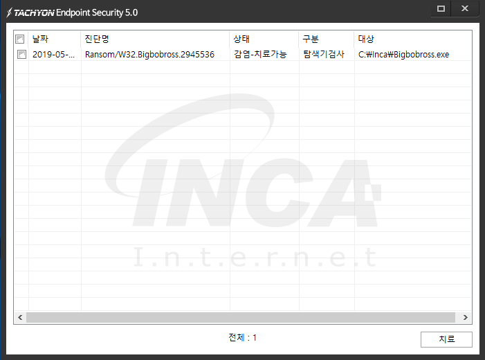 상기 악성코드는 잉카인터넷 안티바이러스 제품 TACHYON Internet Security 5.0 에서 진단 및 치료가 가능하다.