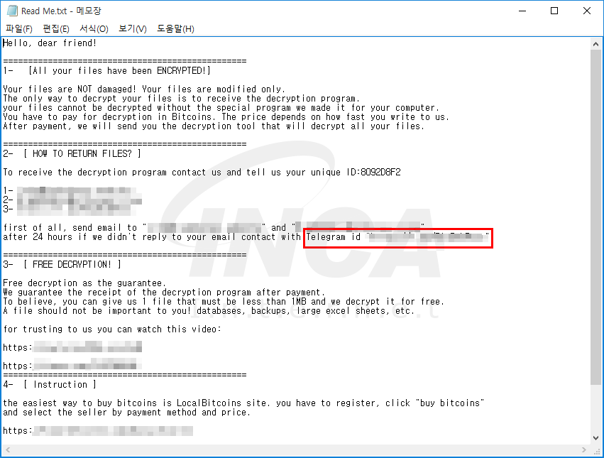 랜섬노트에는 암호화 사실과 더불어 연락 방법, 비트코인 구매 안내 등을 담고 있다. 특이한 점은 보통의 랜섬웨어는 토르 브라우저를 통한 사이트 접속이나, 이메일 주소를 통해 연락하도록 하지만, 해당 랜섬웨어는 이메일 주소 뿐 아니라 텔레그램 메신저 아이디도 함께 안내한다.