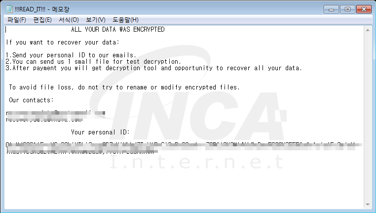 해당 랜섬웨어는 일반적인 형태의 랜섬웨어로 정확한 유포 경로는 밝혀지지 않았다.