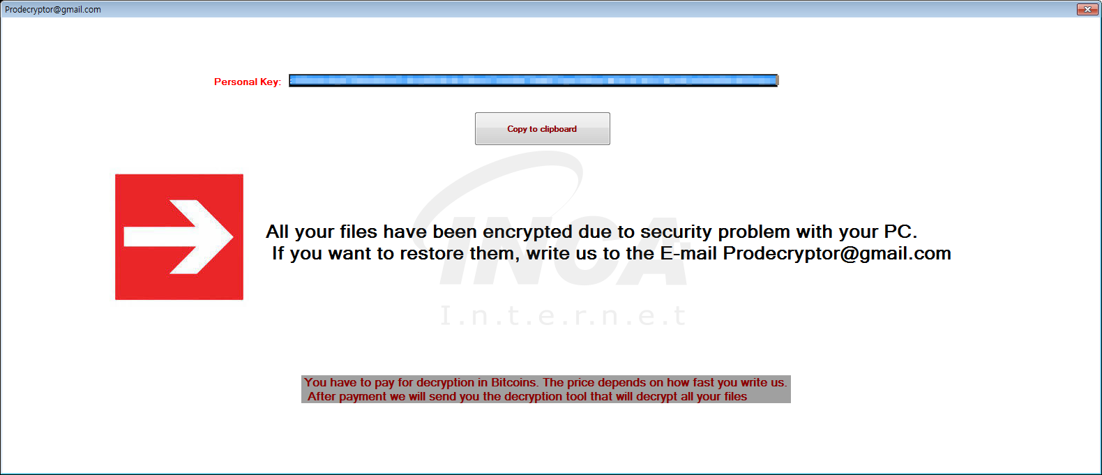 4월 말, 발견된 Prodecryptor 랜섬웨어는 Hiddentear 오픈소스로 만들어졌으며, 파일 암호화 후 .Prodecryptor 확장자를 덧붙이며, 아래 [그림 5] 와 같이 Prodecryptor@gamil.com 이라는 이름의 랜섬노트를 띄운다. 아직 정확한 유포경로는 알려지지 않았으며, 오픈소스로 이루어진 만큼 다양한 변종이 발견될 가능성이 있으므로 사용자들은 주의를 기울일 필요가 있다.