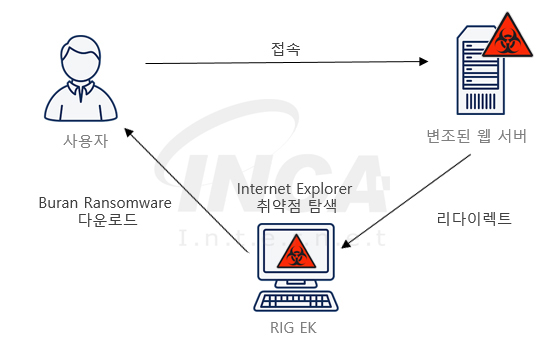 사용자가 변조된 특정 웹 페이지에 접속하면 RIG Exploit Kit으로 리다이렉트 된다. 그리고 RIG Exploit Kit은 사용자 PC에서 Internet Explorer 취약점을 찾아내고 Buran 랜섬웨어 실행파일을 다운로드한다.