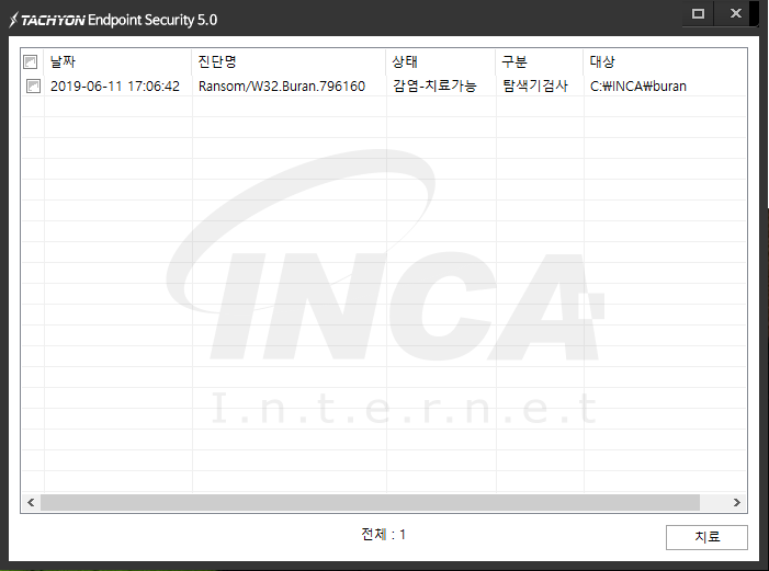 상기 악성코드는 잉카인터넷 안티바이러스 제품 TACHYON Internet Security 5.0에서 진단 및 치료가 가능하다.