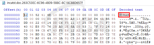 암호화된 파일에는 숫자와 영문이 섞인 랜덤 값을 확장자 뒤에 덧붙이고 랜섬노트를 생성한다. 또한 암호화된 파일을 확인하면 첫 부분에는 “BURAN”이라는 특정 시그니처가 추가된 것을 확인할 수 있다.