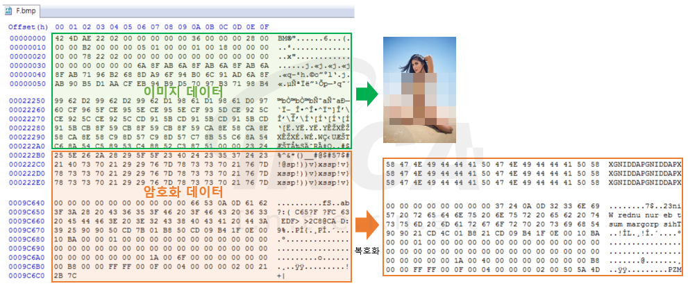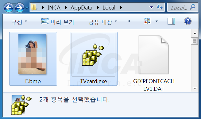실행된 ‘TVcard.exe’는 ‘F.bmp’ 이미지 파일 내부에 존재하는 암호화된 데이터를 복호화 한다. 복호화 된 데이터는 dll 파일이며 ‘TVcard.exe’는 해당 dll 파일을 로드 후 실행한다.
