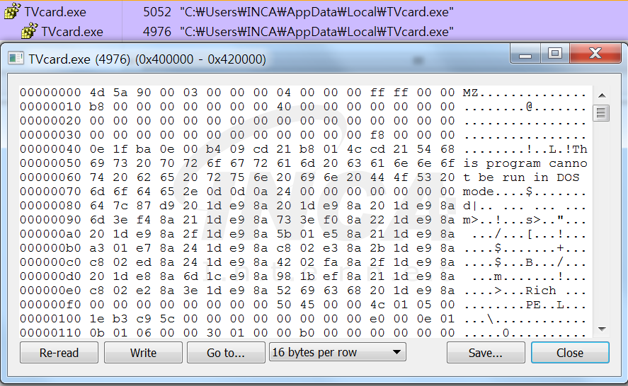 해당 dll 파일 내부에도 암호화된 데이터가 존재하며 복호화 된 데이터는 ‘Remcos RAT’ 실행파일이다. ‘TVcard.exe’는 자기 자신을 새로운 프로세스로 생성하고 이미지 스위칭 기법을 이용해 생성된 프로세스에서 ‘Remcos RAT’을 실행시킨다.