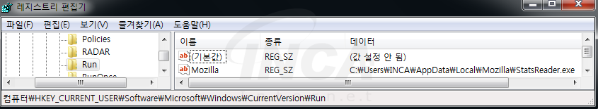 ‘Remcos RAT’은 특정 경로에 자기 자신을 복제하고 자동 실행되도록 Run 레지스트리 키에 등록한다. 또한 레지스트리에 Remcos 이름의 키를 생성하고 실행파일 경로와 라이센스 값을 등록한다.
