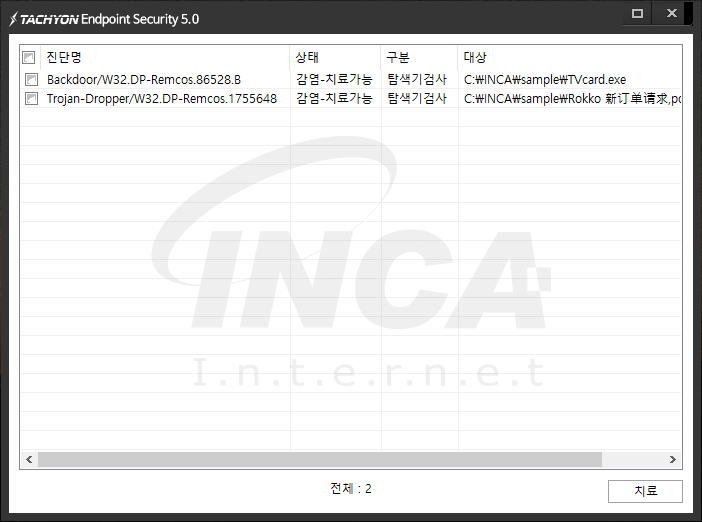 상기 악성코드는 잉카인터넷 안티바이러스 제품 TACHYON Internet Security 5.0에서 진단 및 치료가 가능하다.