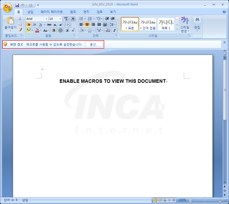 사용자가 .docm 파일을 실행하면 [그림 6] 과 같이 옵션을 통해 매크로를 사용할 것을 유도한다. 사용자는 기능상의 이유로 문서가 제대로 표시되지 않는다고 생각해서 옵션 버튼을 통해 매크로를 실행할 가능성이 있다.