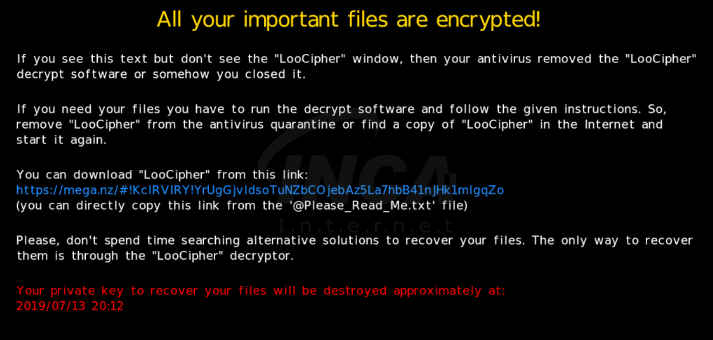 6월 말, 국내에서 새로운 랜섬웨어가 등장했다. LooCipher 랜섬웨어 라고 불리며, 스팸메일을 통한 첨부파일 형태의 악성 Word 문서의 매크로를 통해 유포된다고 알려져 있다.