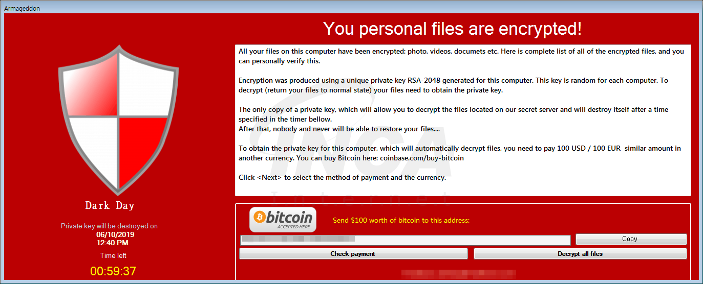 6월 중순, 발견된 Armageddon 랜섬웨어는 정확한 유포 경로는 알려지지 않았다. 해당 랜섬웨어가 실행되면 [그림 3]과 같은 랜섬노트가 사용자 화면에 뜨면서 다른 프로그램 사용이 거의 불가능해진다. 또한 일부 파일을 암호화 한 뒤 확장자를 변형하지 않는 것으로 알려졌다.