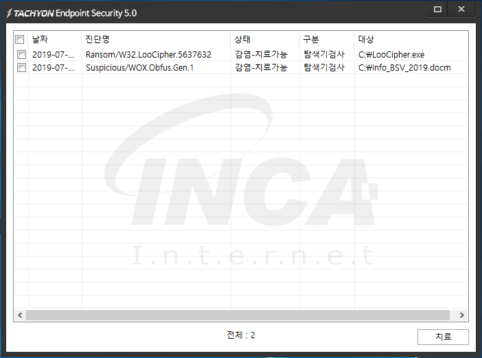 상기 악성코드는 잉카인터넷 안티바이러스 제품 TACHYON Internet Security 5.0 에서 진단 및 치료가 가능하다.