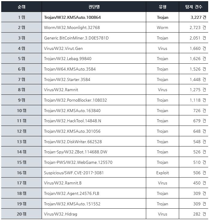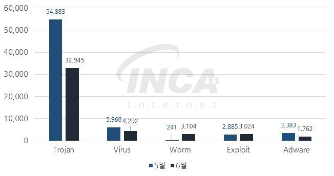 6월에는 악성코드 유형별로 5월과 비교하였을 때 Trojan 과 Virus 의 진단 수가 감소하였다.