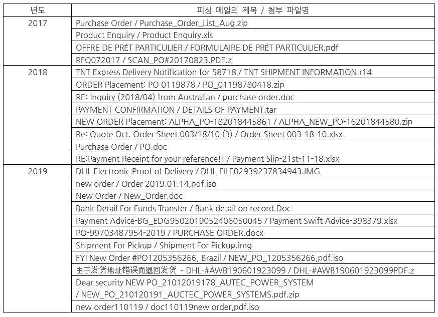 불특정 다수를 대상으로 한 피싱 메일은 구매 주문서, 제품 문의, 배송 정보 등의 내용이며 2017년부터 현재까지 유포 사례가 점차 증가하는 것으로 보인다.