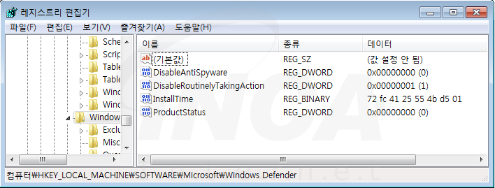 레지스트리 편집기를 통해 악성 동작을 감지하지 않도록 Windows Defender의 설정을 변경한다.