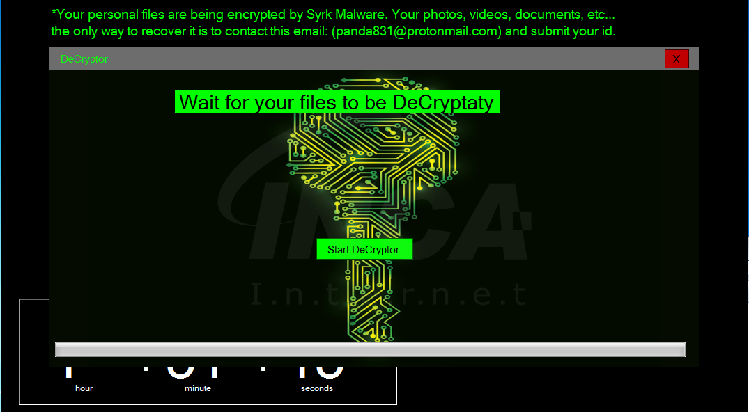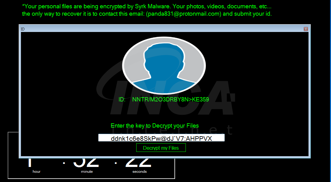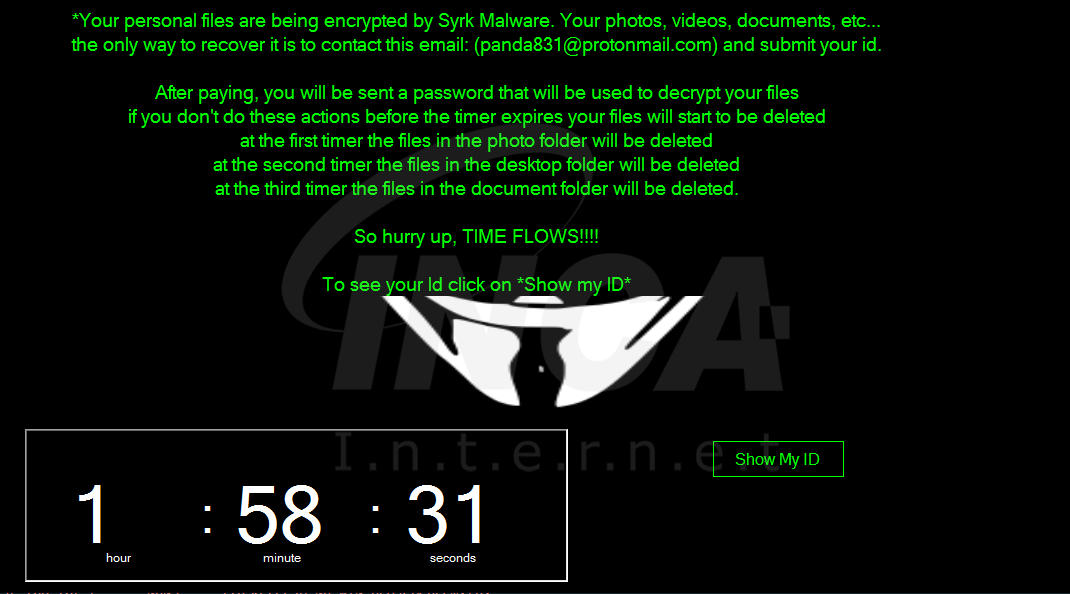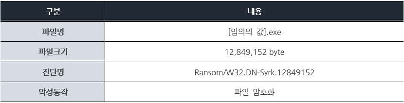 지난 8월 1일 syrk 랜섬웨어가 처음 등장하였다. 해당 랜섬웨어는 파일을 암호화 한다는 점에서는 일반적인 랜섬웨어와 동일하지만, 복호화 키를 감염된 사용자 PC내에 저장하는 것으로 보아 현재 개발 단계 중이거나, 제작자의 실수로 보여진다. 하지만, 랜섬웨어의 특성 상 파일 암호화 시 물질적, 금전적 피해가 커지기 때문에 지속적인 주의를 기울일 필요가 있다.