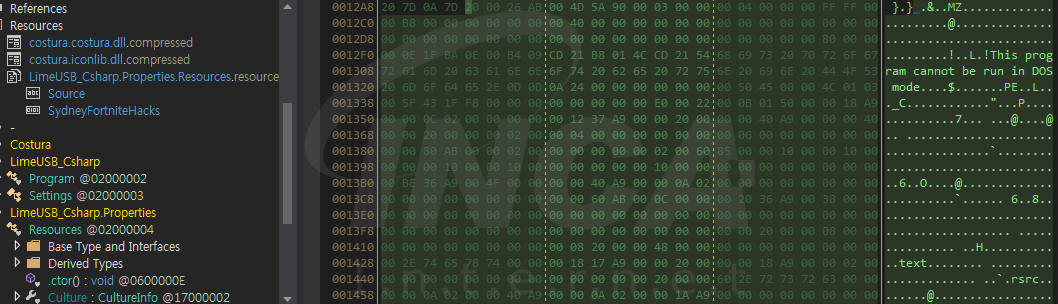 생성되는 SydneyForniteHacks 는 LimeUSB_Csharp.exe 파일 생성을 제외하고 숙주 파일과 동일한 동작을 수행한다.