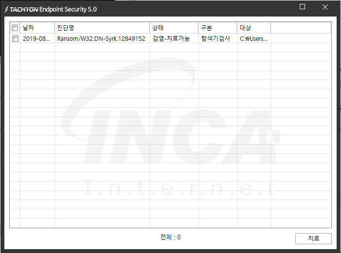 상기 악성코드는 잉카인터넷 안티바이러스 제품 TACHYON Internet Security 5.0에서 진단 및 치료가 가능하다.