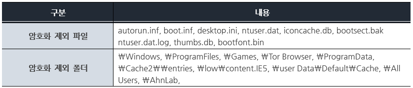 이후 아래 [표1]의 암호화 제외 대상 이외에 모든 파일을 암호화하며, 바탕화면을 변경하고 랜섬노트를 생성한다.
