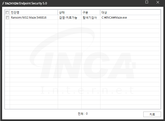 상기 악성코드는 잉카인터넷 안티바이러스 제품 TACHYON Endpoint Security 5.0에서 진단 및 치료가 가능하다.