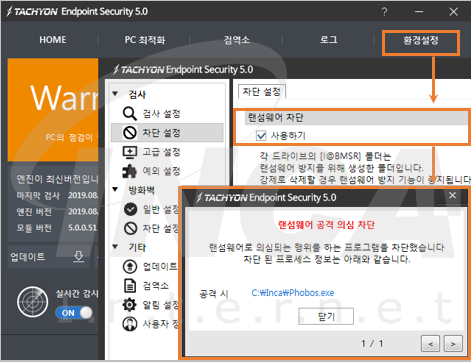 TACHYON Internet Security 5.0 에서 랜섬웨어 차단 기능 (환경설정-차단 설정-랜섬웨어 차단)을 이용하면 의심되는 파일 암호화 행위를 차단할 수 있다.