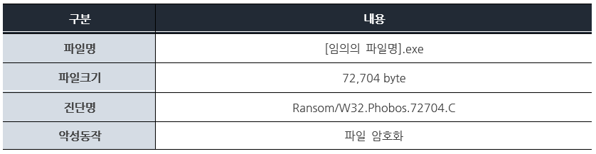 7월에 발견된 Phobos 랜섬웨어는 기존에 있던 Dharma 랜섬웨어의 변종으로 보여진다. 또한 암호화 확장자를 달리한 변종들이 많이 발견되고 있다. 아직 정확한 유포 경로는 알려지지 않았으나, 다수의 변종이 출현한 만큼 지속적인 관심을 갖고 주의를 기울일 필요가 있다.