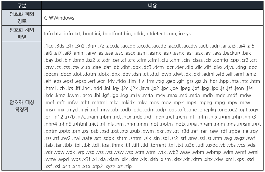 프로세스 종료 후에 아래 [표 2] 에 해당하는 암호화 조건에 맞는 파일을 선별한 뒤 암호화를 진행 한다.