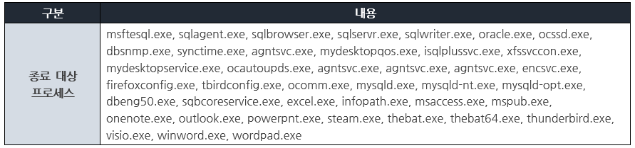 현재 실행 중인 프로세스를 탐색하여 아래 [표 1] 과 같은 목록의 프로세스 실행되고 있을 경우 종료를 시도한다. 이는 암호화 동작을 좀 더 수월하게 진행하기 위한 동작으로 보여진다.
