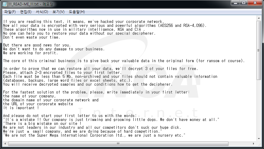 해당 랜섬웨어는 일반적인 형태의 랜섬웨어로 정확한 유포 경로는 밝혀지지 않았다.