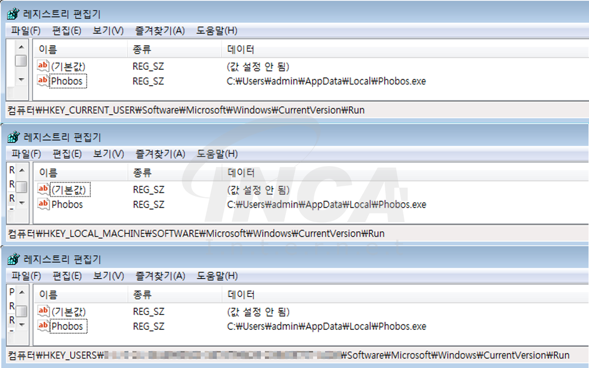 ‘HKEY_USERS\[사용자보안식별자]\Software\Microsoft\Windows\CurrentVersion\Run’