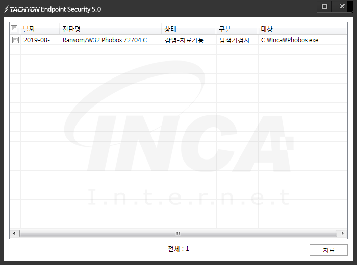 상기 악성코드는 잉카인터넷 안티바이러스 제품 TACHYON Internet Security 5.0 에서 진단 및 치료가 가능하다.