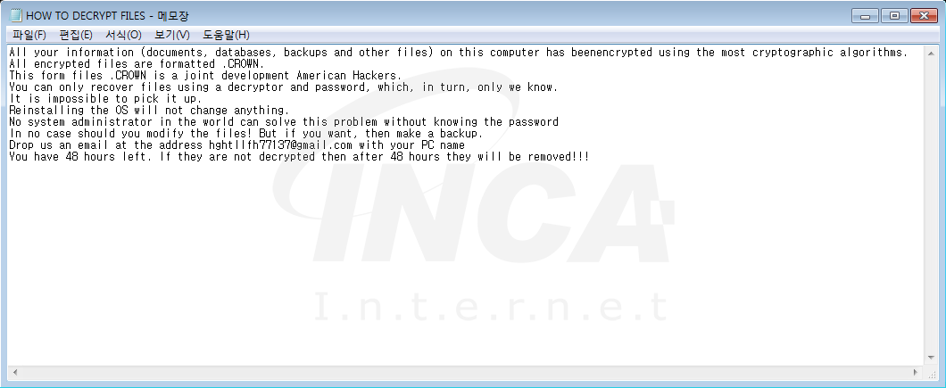 7월 초 발견된 Crown 랜섬웨어는 아직 정확한 유포 경로는 알려지지 않았다. 랜섬웨어가 실행되면 암호화 동작 후에 .CROWN 이라는 확장자를 추가하며, [그림 5]과 같은 랜섬노트를 통해 사용자에게 48시간 내에 연락을 취할 것을 요구한다. 아직 구체적인 피해사례가 알려지진 않았지만, 최근 유포되고 있는 랜섬웨어인 만큼 사용자들의 주의를 요한다.