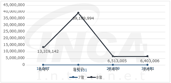 8월 한달 동안 악성코드 진단 현황을 주 단위로 살펴보았을 때 7월에 비해 증가한 추이를 보이고 있다.