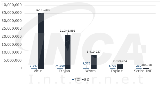 8월에는 악성코드 유형별로 7월과 비교하였을 때 Virus 와 Trojan 의 진단 수가 증가하였다.
