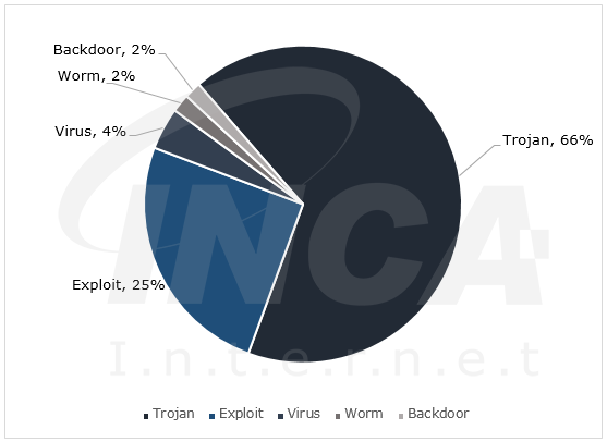 8월 한달 간 탐지된 악성코드를 유형별로 비교하였을 때 Trojan(트로잔)이 66%로 가장 높은 비중을 차지하였고, Exploit(익스플로잇)과 Virus(바이러스)가 각각 25%와 4%, Worm(웜)와 Backdoor(백도어)가 각각 2%, 2%씩으로 그 뒤를 따랐다.