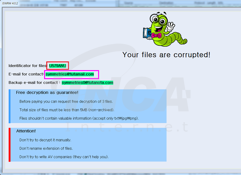 파일이 감염되면 ‘파일명.확장자.[ID].[Email].JSWRM’ 으로 파일명이 변경된다.