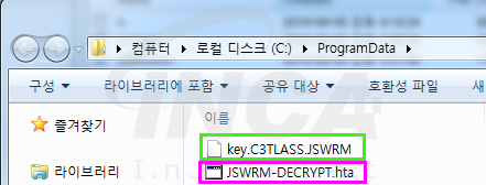 C:\ProgramData 경로에 ‘key.[ID].JSWRM’ 파일명으로 특정 문자열에 대하여 AES 암호화하여 생성된 키 값이 있다. 하지만, 감염할 때에는 RSA 암호화도 진행하여 파일 복구에는 어려움이 있다.