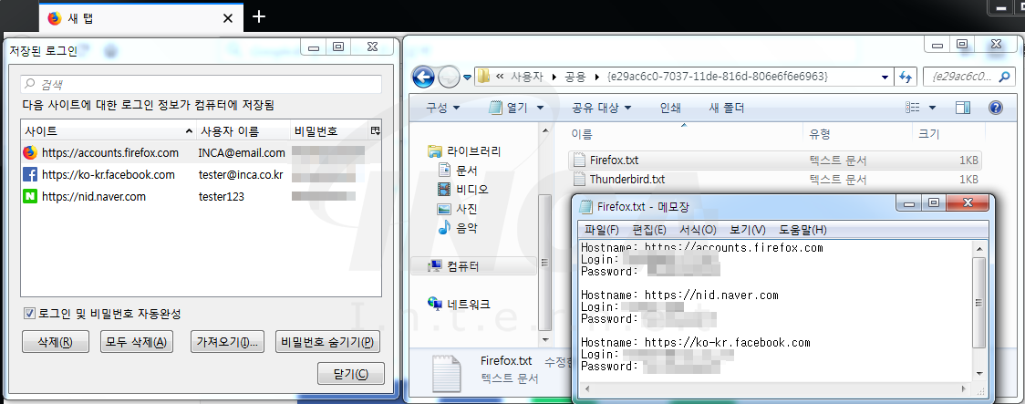 그리고 Mozilla Thunderbird와 FireFox 에 저장된 로그인 계정정보를 수집하기 위해 응용프로그램이 설치된 경로에서 ‘logins.json’ 파일에 접근한다. ‘logins.json’ 파일에는 암호화된 로그인 계정 정보가 저장되어 있으며, 이를 복호화한 뒤 각각 ‘Thunderbird.txt’, ‘Firefox.txt’ 파일로 저장한다.